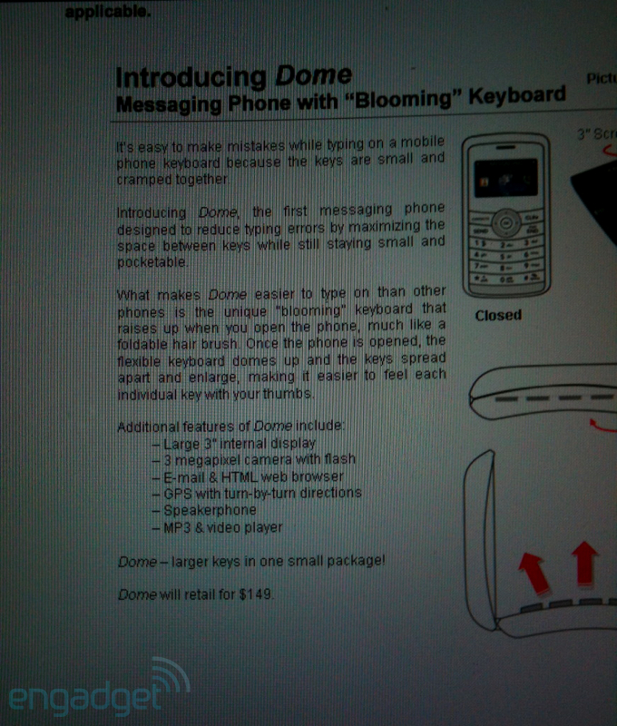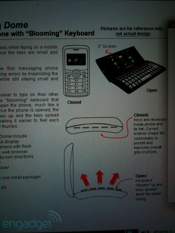 The most interesting of the recently leaked models could be "Dome", which is based on the idea of the old Nokia communicators: it seems a standard handset when closed, but after opening, we get to see its large internal display and QWERTY keyboard. This is not just any kind of QWERTY keyboard, as based on the description it has an arced design and it gets sunk into the bottom part when closed. The device, featuring a 3" display, a 3 megapixel camera, a full HTML browser and a GPS module, is expected to have a price of 149 dollars with subscription.