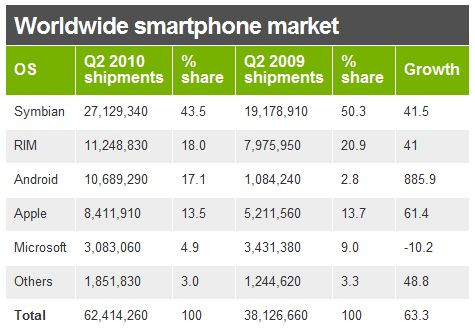 A Canalys legfrissebb beszámolója is egyértelműen megerősítette a piaci elemzők korábbi várakozásait, mely szerint 2011 elején már az Android lehet a piac második legerősebb platformja. A számos különböző gyártópartnernek köszönhetően az idei év második negyedévében összesen 10,7 millió Google platform köré épített okostelefon talált gazdára, mely 886 százalékos éves növekedést jelent, és ezzel együtt a piac 17,1 százalékát tudhatja magáénak. Ugyanezen időszak alatt az Apple összesem 8,4 millió iPhone-t tudott értékesíteni, mely az éves 61,4 százalékos növekedés ellenére is már csak a piac 13,5 százalékának megtartására volt elegendő, vagyis a részesedést tekintve 0,2 százalékos visszaesést jelent. A legnagyobb, 6,8 százalékos visszaesést a Nokia által dédelgetett Symbian platform produkálta, ám a finn óriés reményei szerint a számos új funkcióval kecsegtető Symbian^3, majd pedig a jövő év elején debütáló Symbian^4 segítségével a jelenlegi 43,5 százalékos részesedés újra 50 százalék fölé lesz tornászható.