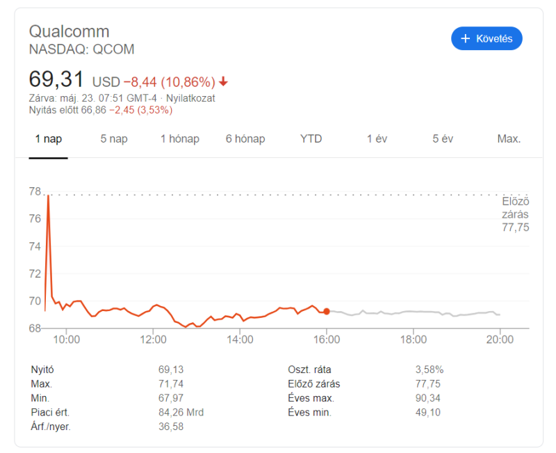 A Qualcomm részvényei az ítélethirdetést követően 69,30 dolláron állnak, ami azonnali, 10,9%-os visszaesést jelent. A Qualcomm nem ért egyet az ítélettel és fellebbezni fog.