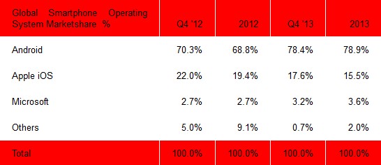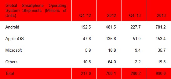 Az elemzői várakozásoknak megfelelően tavaly közel egymilliárd, pontosabban 990 millió okostelefon talált gazdára, mellyel alaposan megelőzték a hagyományos telefonokat. Az összes piacra dobott készülék 79 százalékán Android operációs rendszer teljesített szolgálatot, mely továbbra is felfelé ívelő pályán halad. A Strategy Analytics elemzése szerint a Windows Phone platform az olcsóbb készülékek sikerének köszönhetően szintén növelni tudta relatív részesedését, miközben az iOS platform részaránya 13 százalékra mérséklődött. Fontos megjegyezni, hogy a 153,4 millió eladott iPhone bőven túlmutat az egy évvel korábbi eredményen, a relatív részesedés csökkenése csak annyit jelent, hogy az Apple készülékek iránti kereslet kisebb mértékben bővül az okostelefonok térnyerésénél.
