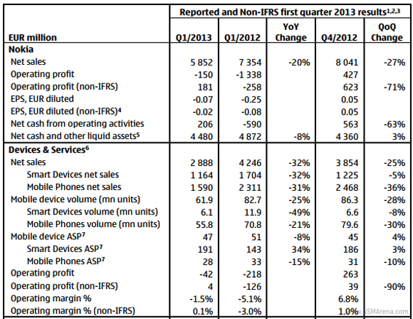 A Nokia közel 14 éven át a világ legnagyobb gyártója volt a leszállított készülékek mennyisége alapján, noha nyereség terén a „trónfosztás” már néhány éve megtörtént, amikor először az Apple, majd a Samsung vált a szektor hasznának igazi lefölözőjévé. A Windows Phone platform lassú felfutása és áreróziója továbbra is komoly veszteségeket okoz a Nokia számára, hiszen az olcsó Android-alapú modellek egyre inkább elkezdik felemészteni a hagyományos mobilpiacok szegmensét is, mely hosszú ideig a Nokia bevételi forrásának gerincét jelentette. A Nokia mobiltelefonos részlege az év első három hónapjában 61,9 millió készüléket értékesített, mely az előző évhez képest 25, az előző negyedévhez képest 28 százalékos visszaesést jelent. Az egyetlen pozitívum, hogy a Lumia modellek forgalma egyetlen negyedév alatt 27 százalékkal emelkedett. A Symbian modellek kikopása miatt a továbbra is veszteségesen üzemelő térképészeti részleg belső eladásai is jelentősen csökkentek, míg a Nokia Semens Networks az előző negyedévhez képest 30 százalékos bevétel visszaesése ellenére továbbra is nyereségesen üzemelt, igaz, mindössze 3 millió euró profitot realizált. A teljes Nokia csoport vesztesége 150 millió euró körül alakult.