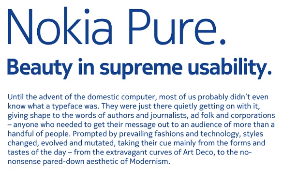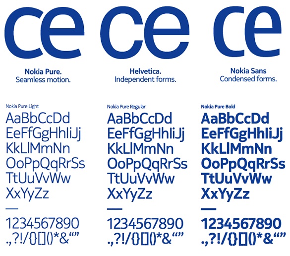 A Windows Phone platformra történő átállás mellett a cég nagyobb szabású arculatváltásra is készül, melynek jegyében a cég kiadványaiban és készülékeiben használt betűtípus is leváltásra került. A „Nokia Pure” néven bemutatott karakterkészletben a betűk sokkal frissebb és letisztultabb hatást keltenek, melyet a finn óriás a „c” és „e” betűk kapcsolatával is demonstrált. Az alant látható kezelőfelület látványtervek csak koncepciók, és ilyen formában egészen biztosan nem kerülnek felhasználásra, csapán a telefonokon való megjelenés bemutatására hivatottak.