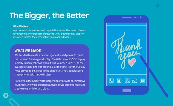 A történet az AMOLED technológia integrálásával kezdődik, majd a 2011-ben még igencsak megdöbbentő méretűnek számító Samsung Galaxy Note 5,3 hüvelykes megjelenítőjével folytatódik, ami azóta valóban korszakalkotónak bizonyult. A kijelzőméretek folyamatosan növekedtek, majd jött a Galaxy Note Edge a jobb oldalon ívelt kialakítással, ami 160 pixeles extra sávon kínált gyorsfunkciókat és speciális felületeket. A Note Edge-el bemutatott koncepció a Galaxy S6-os szériával épült végérvényesen a kánonba, az ívelést pedig a kijelző formátumának módosulása követte.