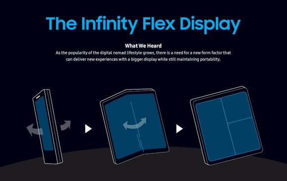 Az Infinity Flex Display viszont merőben új kategóriát képvisel. A képarány manipulálása és a különböző mechanikus megoldások mellett a megjelenítő mérete látszólag már csak úgy növelhető a készülék méretének ésszerű határokon belül tartása mellett, ha konkrétan össze lehet hajtani a telefont. A Flex Display pont ezt teszi lehetővé. Készülék még nincs, a Samsung viszont bemutatta az első elasztikus OLED paneljét. A megjelenítő teljes terjedelmében 7,3 hüvelyk, ezt lehet hosszában félbehajtani, hogy emberi méretű valamit kapjunk.