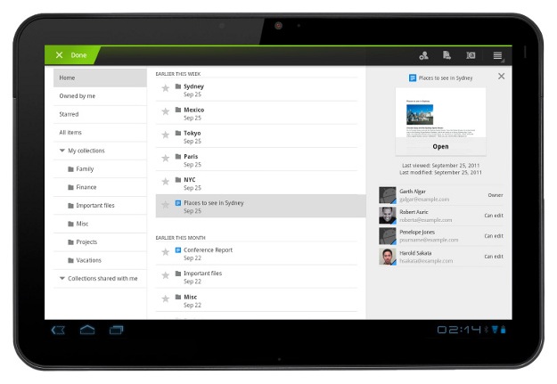 Bemutatkozott az Android-alapú internettáblákra szánt Google Docs legújabb változata, mely újragondolt kezelőfelületének köszönhetően jóval kényelmesebbé teszi a dokumentumok kezelése. A három panelből álló kezdőképernyő bal oldali részén a szűrők és kollekciók kezelésére nyílik lehetőség, míg a középső, legnagyobb részt a dokumentumok listája foglalja el, jobb oldalt pedig a kiválasztott állomány részletei láthatóak. Ez utóbbi az előnézeti kép mellett azon személyek listáját is tartalmazza, melyek megjeleníthetik vagy szerkeszthetik az adott állományt. Az új változat 46 nyelven – köztük magyarul is – érhető el az Android 3.0 vagy újabb operációs rendszerrel szerelt internettáblákra.