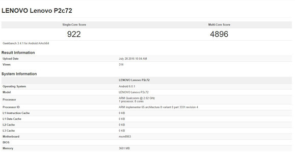 A benchmark alapján az új készülék a Qualcomm 14 nanométeres gyártástechnológiával készülő, nyolc, maximum 2 GHz-es Cortex-A53 magot magába foglaló Snapdragon 625-ös SoC-ját kapja, Adreno 503-as IGP-vel és 4 GB rendszermemóriával kiegészítve. Az idén bejelentett chipset támogatja a Qualcomm Quick-Charge 3.0-s gyortöltési szabványt is. A Lenovo 6.0.1-es Androidot futtató újdonsága egymagos feldolgozással 922, míg több magos processzálással 4896 pontot hozott össze.