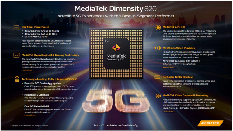A MediaTek a Xiaomi csoport alelnökével és a Redmi brand menedzserével együtt mutatta be a legfrissebb, középkategóriás 5G lapjkját. A készüléket egyelőre nem fedték fel, csak annyi biztos, hogy az AnTuTuban 400 ezer pont körül teljesítő Dimensity 820 5G a Redmi 10X-ben debütál. A 7 nanométeres node-on gyártott SoC szimmetrikus négymagos kialakítást kapott, maximum 2,6 GHz-es Cortex-A76-os egységekkel a teljesítménycentirukus halmazban és Cortex-A55-ös magokkal az energiahatékony klaszterben.