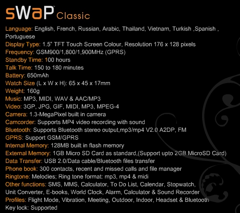 Az óramobilok története egészen hosszú múltra tekint vissza, és noha az alapötlet igen előmutató, ezidáig egyetlen olyan megoldás sem született, mely valóban karóra méretben kínált volna óra funkciót. Az alant látható 65x45x17 milliméteres és szíjjal együtt 160 grammos sWaP szintén nem nevezhető ultrakompaktnak, de a maga 358 dolláros, azaz 82 ezer forint körüli árához képest, kategóriáján belül egészen sokat kínál. Az 1,5 hüvelykes, 176x128 képpontos kijelzővel, 1,3 megapixeles kamerával, 128 MB belső memóriával, microSD kártyahellyel, sztereó Bluetooth modullal és 3 óra beszélgetést kínló 650 mAh kapacitású akkumulátorral felszerelt jövevény alapcsomagjában 1 GB kapacitású memóriakártya is helyet kapott. Az LG megoldásától eltérően 3G hálózatokon nem használható sWaP Classic az Amazon oldalán érhető el.
