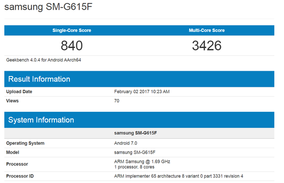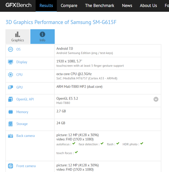 A GFX Bench oldalán SM-G615F modellszámon regisztrált készülék maximum 2,3 GHz-re skálázott, nyolcmagos MediaTek Helio P20-as SoC-kal tűnik fel, míg a Geekbench 1,69 GHz-et mutat. Ez mondjuk még mindig nem zárja ki a Helio P20 lehetőségét, a Geekbench rendre az energiatakarékos klaszter maximum órajelét jeleníti meg, ami az MT6757 esetében pont 1,6 GHz. Ezzel együtt ARM Samsung megjelölés áll előtte. Minden más megegyezik a két adatbázisban.