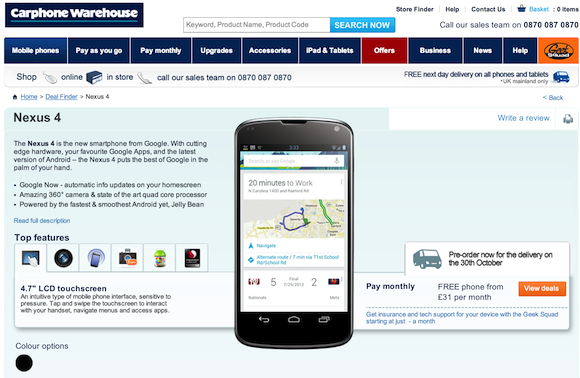 A Google október 29-én egy nagyszabású sajtóeseménnyel készül, melyen az előzetes értesülések és pletykák alapján új Nexus készülékek bemutatása is várható. A Samsung gyártmányú Nexus 10 táblagép megjelenése mellett egy új referenciamobil debütálása is igen valószínű, az LG gyártmányú telefon érkezését már több nemhivatalos forrásból is megerősítették. A legerősebb bizonyíték talán most érkezett, az angol illetőségű Carephone Warehouse webáruház ugyanis felvette a kínálatába a koreai gyártó újdonságát. Az aloldal természetesen csak nagyon rövid ideig élt, néhány szemfüles látogató azonban azonnal kiszúrta a Nexus 4 névre hallgató készüléket.