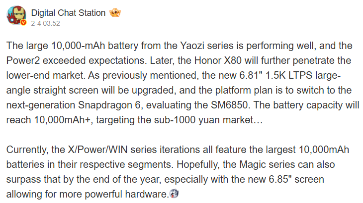 A Honor X70 tavaly júliusban érkezett 8300 mAh-s, szilícium-szén akkumulátorral, és ha hihetünk a friss értesüléseknek, a gyártó a következő generációnál tovább emelné a tétet: a Honor X80 állítólag 10 000 mAh-s telepet kaphat. Az információ a Digital Chat Stationtől származik, a Honor elvileg már dolgozik az X80-on, méghozzá ekkora kapacitással.