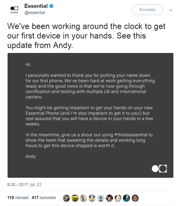 Andy Rubin nyár elején mutatta be az ultimate okostelefonnak szánt Essential Phone PH-1-et, amely a kor követelményeit kielégítő hardveres és szoftveres képességek mellett a legfrissebb dizájnelveket is integrálja. A készülék ígéretes, ennek megfelelő árral, a probléma viszont az, hogy a bemutatón ígért szállítási határidő megcsúszott. Ez alapvetően bármilyen okból előfordulhat, viszont a vezetőség nem nagyon, vagyis egyáltalán nem kommentálta az esetet, érdemi információ pedig hónapok óta nem érkezik az illetékesektől.