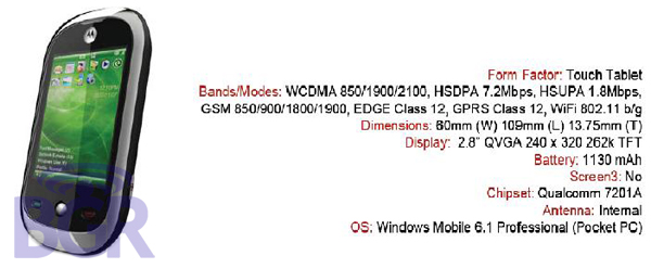 Ismét a Boy Genius Report oldala leplezett le egy készüléket, mely ezúttal a Motorola „Atila” belső néven fejlesztett modellje. Az újdonság külső vonásaiban teljes mértékig az „Alexander” belső nevű modellt idézi, ám ezúttal a lemaradt a QWERTY billentyűzet és helyette csak az érintőkijelző használható beviteli eszköz gyanánt. Habár a 7,2 megabites HSDPA letöltés és az 1,8 megabites HSUPA feltöltés, a WLAN elérés, a Windows Mobile 6.1 operációs rendszer és az 1130 mAh kapacitású akkumulátor jelenléte nem hangzik rosszul, azért mégis igen komoly gondok lehetnek a jövevénnyel mégpedig kijelző és méret terén. A BGR előzetes adatai szerint ugyanis a készülék 108x80x13,75 milliméteres méretű, mely a nem éppen keskeny iPhone-nál is majdnem két centivel szélesebb kialakítást jelent. Amíg az Apple üdvöskéjének 3,5 hüvelykes kijelzője miatt érthető ez a szélesség, addig a Motorola „Atila” mindössze 2,8 hüvelykes és 240x320 képpontos érintőkijelzője semmiképp nem igényel ekkora keretet.