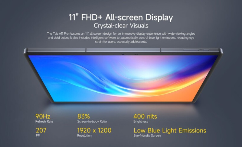 A Tab A11 Pro sötétszürke alumínium házban érkezik majd, 7,6 milliméteres vastagsága és 500 grammja átlagosnak mondható. A kijelző 11 hüvelykes IPS LCD panel a táblagépben, felbontása 1920 x 1200 pixel, frissíteni pedig 90 Hz-en tud. Nem feltétlenül jellemző a kisebb kínai márkákra, de a Tab A11 Pro már Widevine L1-es biztonsági szinttel kerül forgalomba, így nagy felbontásban lehet rajta SVoD tartalmakat fogyasztani. Az Ulefone büszke erre, ahogy a táblagépben sztereóban megszólaló hangszórónégyesre is.