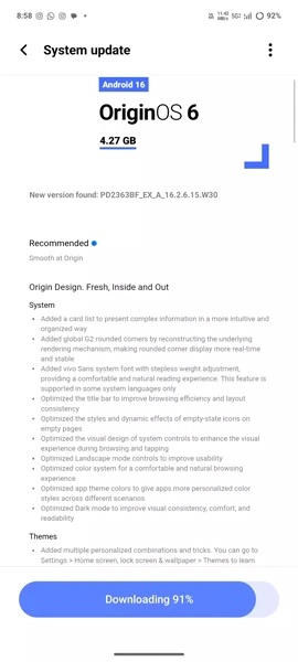 Az ázsiai felhasználók 4,3 GB-os csomagot kaptak, az Android 16-os frissítéssel új vizuális környezetre számíthatnak majd a felhasználók a kicsit régies FunTouch OS-t váltó OriginOS-szel. Az OriginOS 6-ról a Vivo X300 Pro és a Vivo X300 tesztjében is írtunk, külön foglalkozva az olyan platformokon átívelő extrákkal, mint az Office Kit és az EasyShare.