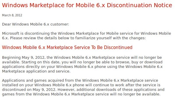 A Microsoft korábbi bejelentésének megfelelően idén végleg leáll az előző korszakot jelentő Windows Mobile 6.x operációs rendszerek szoftveres támogatása, mely a kapcsolódó online piactér leállítását is jelenti. A szoftveróriás már tavaly májusban leállította a régebbi platformra szánt alkalmazások befogadását, május 9-étől pedig az online piactér teljes egészében leállításra kerül, vagyis a Windows Marketplace a jövőben már csak Windows Phone alkalmazásokat vonultat fel a kínálatában. Ezt követően újabb szoftverek beszerzésére már csak közvetlenül a fejlesztői oldalakról vagy alternatív alkalmazásboltokból nyílik lehetőség.