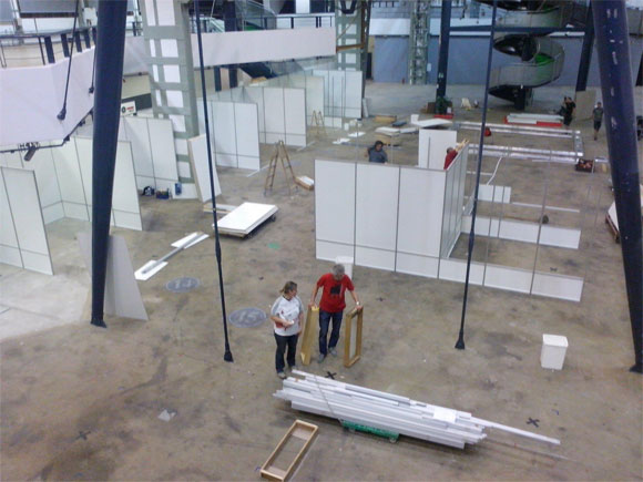 Szombaton este 6-kor már a stáb összes autói meg voltak pakolva mindenféle kellékekkel, pogácsa, ásványvíz, nyomtató, kábelek, poszterek, térképek, ragasztók, kötelek, zsinórok, számítógépházak, meg még a fene sem tudja, hogy mi minden került be a verdákba és 7-kor már izomból rámoltuk kifelé a pakkot a Millenáris hátsó bejáratánál. Minden ütemterv szerint zajlott, az éjszaka folyamán felépültek a standok, mi pedig váltottuk egymást, én 3-ig maradtam, engem Legendd küldött haza, őt 5:30 körül Bocha, hogy aztán 8-ra már a teljes stáb a helyszínen legyen. Kind pedig egyszemélyi felelőse volt az App Szigeteknek, nem is volt benne hiba. És bár ez a bejegyzés messze nem arról szól, hogy reklámozzunk benne bárkit is, meg kell mondjam, hogy a Standbau csapata, Zsuzsával az élen brilliáns munkát végzett, pont olyan lett a látkép, mint ahogyan azt én előtte egy alaprajzra felskicceltem. Úgy mentem haza éjjel 3-kor, hogy a standok már álltak, és úgy értem vissza, hogy már javában zajlott a beköltözés.