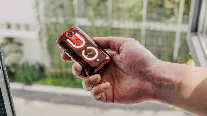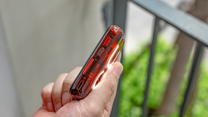 Egyrészt, mint az az előző bekezdésből kiderült, nagyon apró, a ház műanyagból van, a hátlap pedig átlátszó, de az ujjlenyomat-leolvasót és a logót egy-egy fehér fényű LED sor veszi körbe, ezek értesítésjelzőként szolgálnak. A Nothing Phone-hoz vagy a Unihertz Lunához hasonló megoldásról van szó itt is, csak kisebb méretben.