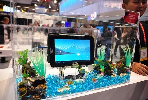 A telefonok és internettáblák legnagyobb ellenfele minden kétséget kizáróan a víz, mely a készülék belsejébe jutva végzetes károkat okozhat. Létezik persze néhány olyan eszköz is, mely hosszabb-rövidebb ideig képes túlélni a vízitúrákat, ám az alant látható Toshiba „Regza Tablet” az első olyan, melyet lubickolás közben még tölteni is lehet. Az egyelőre csak prototípusként létező 10,1 hüvelykes táblagép mágneses rezonancián alapuló töltője a gyártó közleménye szerint nagyobb távolságban is hatékony energia átvitelt biztosít, bár az alant látható kép egyelőre csak néhány centiméteres hatótávolságra enged következtetni. A Toshiba közleménye szerint a „Regza” kereskedelmi forgalomban egyelőre biztosan nem lesz kapható, mivel a prototípus egyetlen célja a vízálló kialakításban és a vezetékmentes töltési technológiákban rejlő lehetőségek szemléltetése.