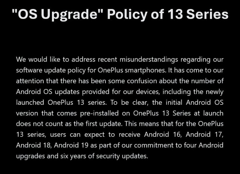 A OnePlus gyorsan reagált a helyzetre, és megerősítették, hogy a készülékre előtelepített rendszer nem számít frissítésnek, így a OnePlus 13 és OnePlus 13R biztosan megkapja az Android 16-ot, 17-et, 18-at és 19 is a hat éves biztonsági támogatás mellett. Mindeközben a terméktámogatásról tájékoztató európai oldalt is frissíteni kellett, mivel a OnePlus 13R esetében csak négy év biztonsági csomagot ígért a táblázat. Felhasználói visszajelzésre már ez is javításra került, a 13R szintén 2031-ig élvezhet védettséget.