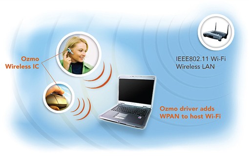 It looks like Bluetooth might get a serious challenger in the near future, as the solution form Ozmo and Intel is intended for the same segment of market which is currently dominated by Bluetooth technology. At this year's Computex expo Intel and Ozmo have announced their WiFi PAN (Personal Area Network) solution, which is specially made for low power-consumption devices. Thanks to this technology low-consumption devices, similar to Bluetooth-based ones, like headsets, mice and other devices can be created, which then can easily connect to WiFi PAN laptops or phones. The greatest advantage of the solution, however, is that there is no need for a separate Bluetooth controller, which there is one less component needed, so there is one less factor that consumes energy. It is not yet known when the first WiFi PAN devices are to be launched, but Belkin is already testing the possibilities of this technology.