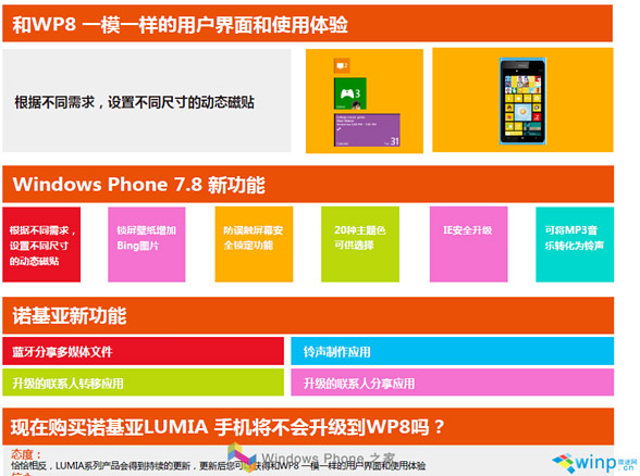 A Microsoft a nyár derekán jelentette be az alapjaitól újraírt Windows Phone 8 operációs rendszerét, mely a magasabb hardverkövetelmények miatt egyetlen korábbi modellre sem lesz elérhető, de szerencsére azokra is átültetésre kerül néhány funkció. A Windows Phone 7.8 frissítésről eredetileg csak annyit lehetett tudni, hogy az új, szimmetrikus elrendezésű kezelőfelületet biztosan megkapja, ám ennél többről nem igazán lehetett hallani. Egy belső használatra szánt Nokia dokumentum azonban néhány további részletre is rávilágított, így például az is kiderült, hogy a testre szabható záróképernyő is elérhető lesz. Sajnos az Internet Explorer 10 nem része a csomagnak, viszont egy integrált MP3 szerkesztő révén a saját zeneszámokból is lehet csengőhangokat előállítani, illetve már 20 alapszín közül lehet majd válogatni. A Windows Phone olasz Facebook oldala a Rooms, SmartGlass és Xbox Music funkciók átültetését is megerősítette, vagyis néhány hasznos funkció szerencsére a korábbi modelleken is elérhető lesz. A pletykákat és közösségi oldalakról származó információkat azonban érdemes fenntartásokkal kezelni, hiszen több esetben előfordult már, hogy egy gyártó regionális Facebook oldala olyan frissítéseket ígért, melyből végül semmi sem lett.
