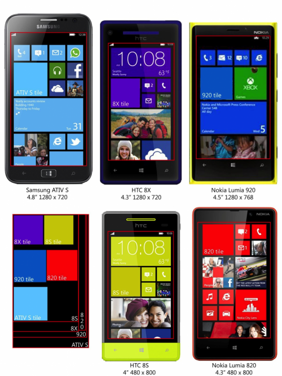 A Microsoft három legfontosabb stratégiai partnere már bemutatta e Windows Phone 8 termékpalettájának első tagjai, melyek belső paramétereik terén rendkívül hasonlóak ugyan, ám az eltérő méretű kijelzők miatt igencsak különböző fizikai paraméterekkel bírnak. Az alábbi kép felső sorában a csúcskategóriába szánt Samsung Ativ S, HTC 8X és Nokia 920 méretarányos képe látható, míg az alsó sorban a középmezőnybe szánt HTC 8S és Lumia 820 társaságában a kijelzők méretének összevetése tekinthető meg. A Windows Phone 8 operációs rendszer október végi leleplezését követően a kvintett nagyjából egy időben, november elején kerül a boltok polcaira.