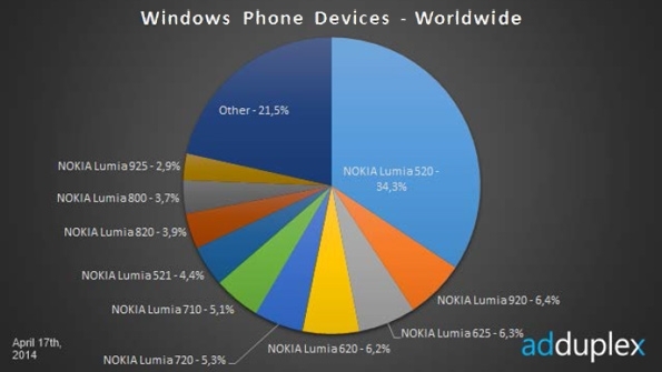 A Lumia 520 térnyerése ugyan megtorpant, de a trónfosztás még igencsak sokat várathat magára, hiszen a második legsikeresebb készülék, a Lumia 625 mindössze 6,5 százalékos relatív részesedéssel bír. Az AdDuplex grafikonjából az is egyértelműen látható, hogy az összes sikeres Windows Phone mobil a Nokia műhelyében készült, mely teljes részesedése immáron 93,5 százalékra növekedett. Az „ezüstérmes” HTC csupán 4,4 százalékos paicrészt tudhat magáénak, míg a Samsung és a Huawei rendre 1,3 és 0,8 százalékos részesedéssel bír. Az egyelőre még csupán fejlesztői változatban elérhető Windows Phone 8.1 már 3,1 százalékos részaránnyal bír, míg a Windows Phone 8 78 százalék körüli részesedéssel bír.