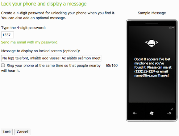 Bár a telefonok elvesztése sohasem egy kellemes élmény, a Windows Phone 7-et futtató készülékek esetén nincsen minden veszve, kapunk egy kis segítséget a mobilunk visszaszerzéséhez, legrosszabb esetben pedig az adataink védelméhez. A redmondiak platformjával szerelt telefonokhoz kapunk ugyanis egy szolgáltatást, amely a készülékek elhagyása esetén jelenthet egy kisebb-nagyobb segítséget. A szolgáltatást a www.windowsphone.live.com weboldalon érhetjük el, a bejelentkezéshez egy Windows Live ID-re lesz szükségünk. Ezen a weboldalon a telefon megtalálására és zárolására irányuló funkciók mellett a SkyDrive-ra feltöltött képeinket is megnézhetjük, valamint a naptárunkat és a névjegyzékünket is menedzselhetjük.