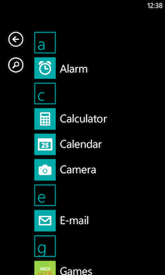 Végül az alkalmazások menü átalakításáról is fellibbent a fátyol. A menü hasonló lesz a névjegyzék jelenlegi szisztémájához, azaz a rendszer a programokat a kezdőbetűk alapján fogja csoportosítani, ezáltal javítva a navigáción. A határokat jelentő négyzetek ugyanis a telefonkönyvben megszokotthoz hasonlóan fognak működni: a betűk megérintésével ugrálhatunk az azonos karakterrel kezdődő csoportok között. A másik újdonság, hogy a programok közötti keresés is elérhetővé válik a frissítés után, amely hasonlóan fog működni, mint azt az automatikus kiegészítéssel (angolul autocomplete) operáló People Hubban megszokhattunk.