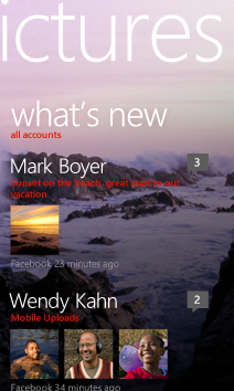 Apropó élő csempe! A Windows Phone 7.5 galériájával immár az egyes albumokat is szabadon kitűzhetjük a kezdőképernyőre, sőt, akár a Facebookról és a SkyDrive-ről is beránthatjuk a mappákat. Az alkalmazás People fülén a Facebook-ismerőseink fotóit is átfuthatjuk, ez eddig sem volt újdonság. De míg a Windows Phone 7 esetében a legfrissebb fotók kerültek ide, a Mango feltelepítése után már csak a legközelebbi ismerőseink képeit húzza be a rendszer. A Windows Phone 7.5-ben az elkészült művek megosztási lehetőségeit is kiterjesztették. Eddig csak fotókat posztolhattunk a Facebook-falunkra, a Mangóban viszont már videókat is feltölthetünk, sőt, ugyanezt a SkyDrive fiókunkkal is megtehetjük. A fotóink SkyDrive-ra történő automatikus feltöltésén is finomítottak: a funkció bekapcsolása után az automatikusan szinkronizált képek priváttá válnak, azaz rejtve maradnak ismerőseink elől, amíg publikussá nem tesszük őket.