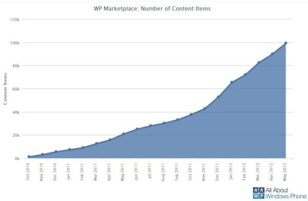 A Windows Phone Marketplace kínálata az elmúlt öt hónap során duplájára nőtt, hiszen az alkalmazás feltöltések száma immáron 100 000 fölé nőtt, vagyis az App Store és a Google Play után harmadikként lépett a hatjegyűek táborba. Fontos megjegyezni azonban, hogy ez a szám nem a jelenlegi katalógus valódi mérete, hanem csupán a Microsoft által ezidáig jóváhagyott tételek száma, melyek közül több mint tízezer idő közben eltávolításra került. Az eredmény ugyanakkor még így is kiemelkedő, hiszen ezen mérföldkövet eddig csak az Apple és a Google tudta átlépni. A Windows Phone Marketplace jelenleg 88 371 alkalmazást kínál letöltésre, mely napi szinten átlagosan 313 új elemmel bővül.