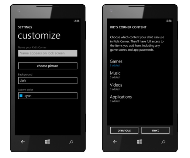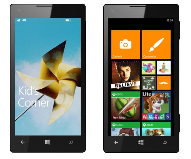 A Windows Phone 8 egyik érdekes újítása a Kid's Corner, vagyis a „gyereksarok” funkció, mely valójában a képernyőzárról balra történő csúsztatással elérhető limitált funkcionalitású másodlagos felhasználói fiókot jelent. A megoldás elsősorban a szülők számára és telefon kölcsönadásakor lehet igazán hasznos, hiszen az elérhető alkalmazások, videók és zeneszámok köre is korlátozható, ráadásul a vendégprofil elérése időben is korlátozható, melyet követően csak egy beállított jelszó beadását követően érhető el. A Microsoft felmérése szerint az amerikai szülők kétharmada hagyja, hogy gyermeke játsszon a telefonjával, mely során nem neki szánt tartalmakhoz is hozzáférhet, illetve akaratlanul is lebonyolíthat vásárlásokat, esetleg módosíthatja a beállításokat. A beállítások között aktiválható Kid's Corner másodlagos profilhoz külön háttérkép és szín is választható, valamint az is konfigurálható, hogy a fő profil utolsó használata után mennyi ideig érhető el jelszó beadása nélkül a másodlagos fiók. A képernyőzárról elérhető gyereksarok a bekapcsológomb rövid lenyomásával bezárható. Fontos megjegyezni, hogy a másodlagos fiók nem teljes értékű profil, vagyis új alkalmazások telepítésére és internet elérésre nincs lehetőség, ugyanakkor a háttérkép és megjelenítés utólag is módosítható.