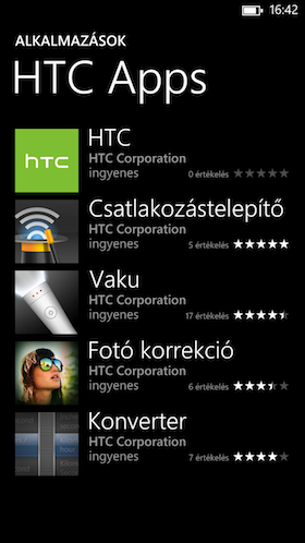 Bónusz alkalmazásokból összesen öt darab áll a felhasználó rendelkezésére. A Fotó korrekció egy egyszerű képszerkesztőt takar, mellyel különféle szűrőket húzhatunk a fotóinkra. A Csatlakozástelepítő a szolgáltatói internetkapcsolat adatainak beállítását vállalja el, a Vaku elemlámpává varázsolja a mobilt. A Konverter személyében egy átváltót tisztelhetünk, segítségével mértékegységeket és pénznemeket konvertálhatunk. A nemes egyszerűséggel csak HTC nevet viselő program az időjárást, az aktuális részvényadatokat és a fontosabb híreket jeleníti meg egy fedél alatt. A programot élő csempeként a főoldalra tűzve a pontos időt láthatjuk.