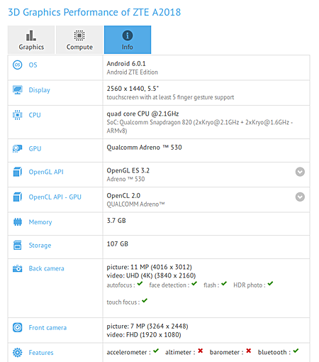 A TENAA és most a GFX Bench adatbázisában megjelent eszköz látszólag pontosan megegyezik az Axon 7 alapmodellel, szintén Snapdragon 820-as alapokra épül 4 GB rendszermemóriával, viszont az Axon 7-tel ellentétben nem 20 megapixels főkamerát említenek a források, hanem a GFX Bench esetében egy 12 megapixeles 4K felvételre alkalmas szenzort, ami az Axon 7s esetében a 20 megapixeles modult egészíti ki, míg a TENAA ugye erre vonatkozó adatokat nem közölt. Viszont mindkét helyen 6.0.1-es Marshmallow rendszert jegyeztek.