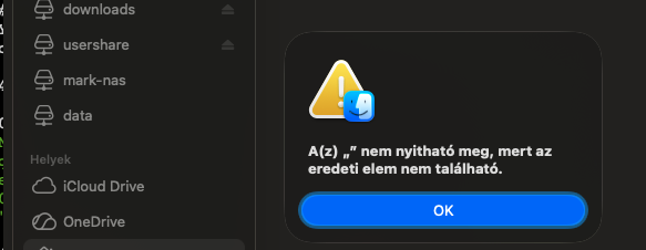A Finder favouritesben levot soha nem csatolta magatol, csak ha rakattintottal (legalabbis, en ugy hasznaltam az elmult evtizedekben). Ha oda az aliast huztad, az mukodott regen es mukodik most is, ha pedig a sharet huztad be, az mukodott regen, ma pedig nem (tahoe alatt), mert sokszor nem talalja a ""-t.
