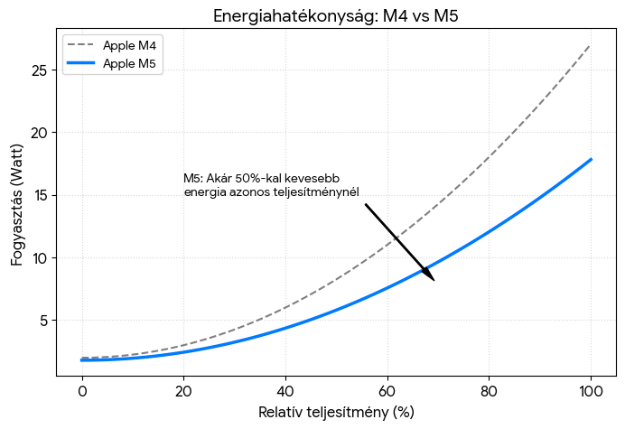 Alapjáraton az M5 gyártástechnológiájának köszönhetően az alapjárati és kis terhelésű fogyasztás 10-15%-kal csökkent. Az Apple szerint közepes terhelésen az M5 ugyanazt a teljesítményt hozza feleannyi energiából, mint az M4. Ez azt jelenti, hogy az M5-ös gép hűvösebb marad.