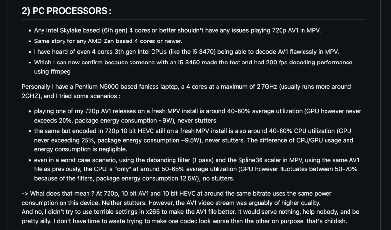 (Megjegyezném, hogy szerintem ha nincs GPU, akkor Quick Sync Video sincs, mert az a GPU része. És most megyek szundizni, szóval nem olvasok jobban utána: de azon is csodálkoznék, ha valami támogatna valamit, amit még ki sem találtak akkor, amikor kitalálták őt magát ;-) , szóval így "gondolomra" eléggé valószínű, hogy tulajdonképpen ugyanarról beszélünk mégis, a GPU hardveres dekódoló képességéről: AV1 azon a téren meg 2020 végétől van. Hogy miért csak akkortól, miközben AV1 meg 2018-tól van - szintén nem nagyon foglalkoztat, mert a végeredményen nem változtat)