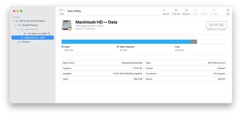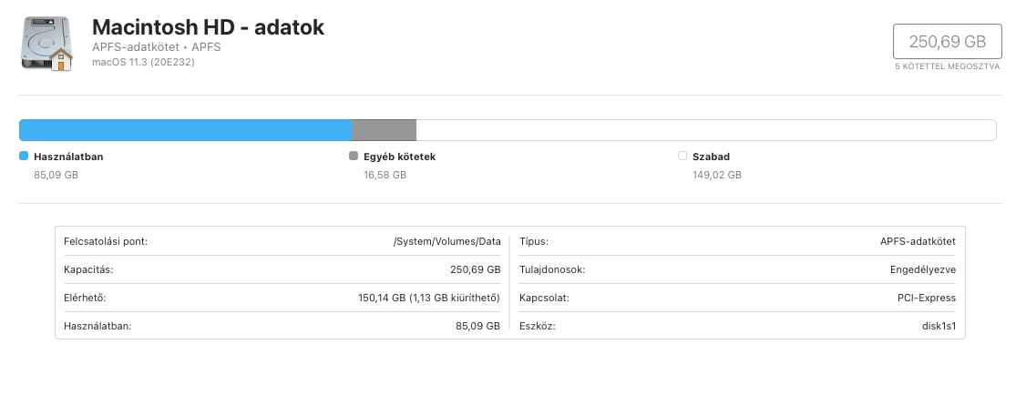 Ha megkattintod, hogy ne az APFS kontenert mutassa, hanem pl a Data particiodat (10.15+) vagy a sima particiodat (10.15-) akkor ott lathatoan irja a fizikai szabad helyet es a purgeable szabad helyet. En mondjuk neha a pokolba kivanom ezt, plane amikor azt hiszem, van eleg helyem, de egy 128 gigas image dd-zese kozben kiderul, hogy nincs.