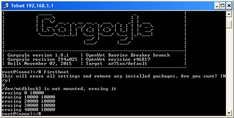 Gargoyle 1.8.1-es rendszerre frissítettem, ami látszólag hibamentesen lezajlott. Frissítés után a router a ledek alapján elindul, de a web felülete nem érhető el, ping-re sem válaszol. DHCP-vel nagy sokára ad címet a rádugott gépnek.Először a TP-link "rejtett" TFTP szerveres unbrick (reset gomb benyomva tart, router bekapcsol) módszerével próbálkoztam, sikertelenül. Aztán észrevettem, hogy a LOCK led helyett, a system led kezdett el gyorsabban villogni. Ebben az állapotban telneten elérhető, és a pingre is válaszol! :-)