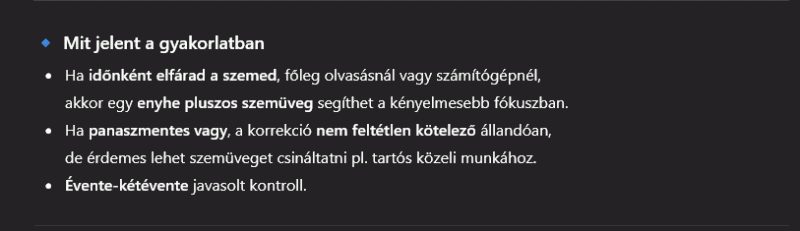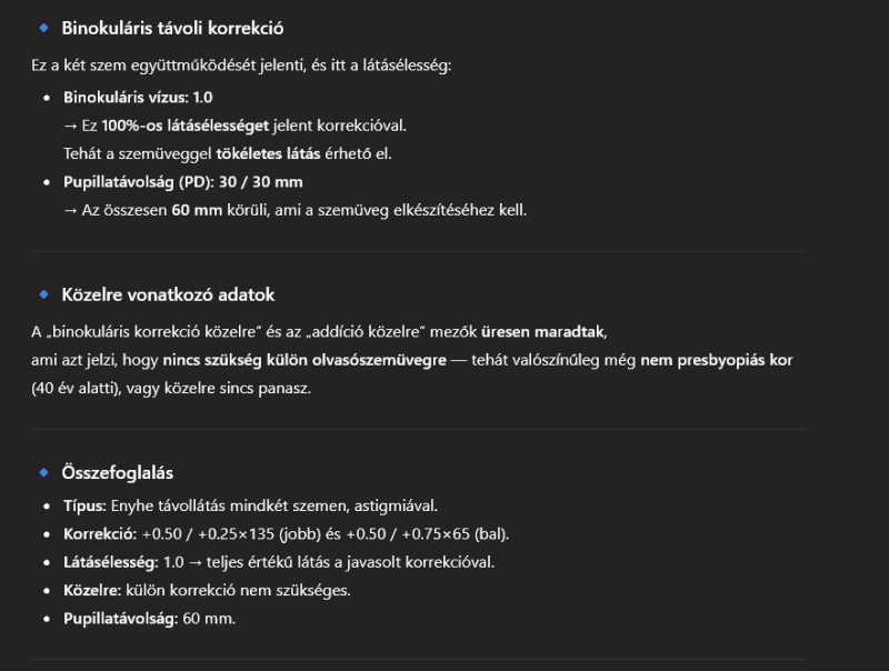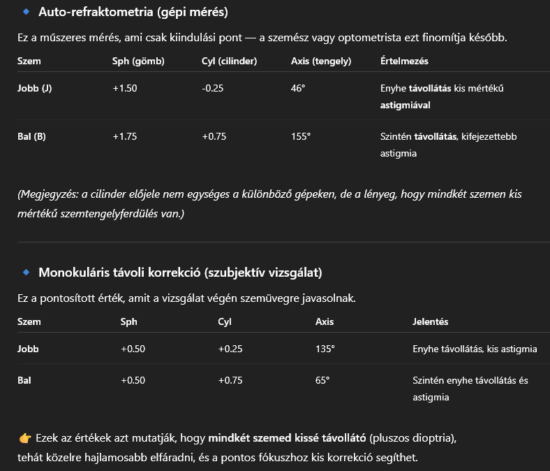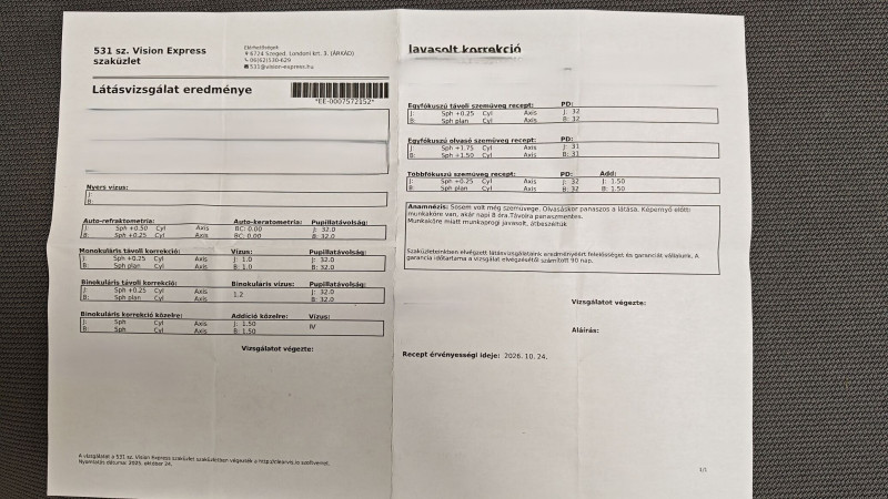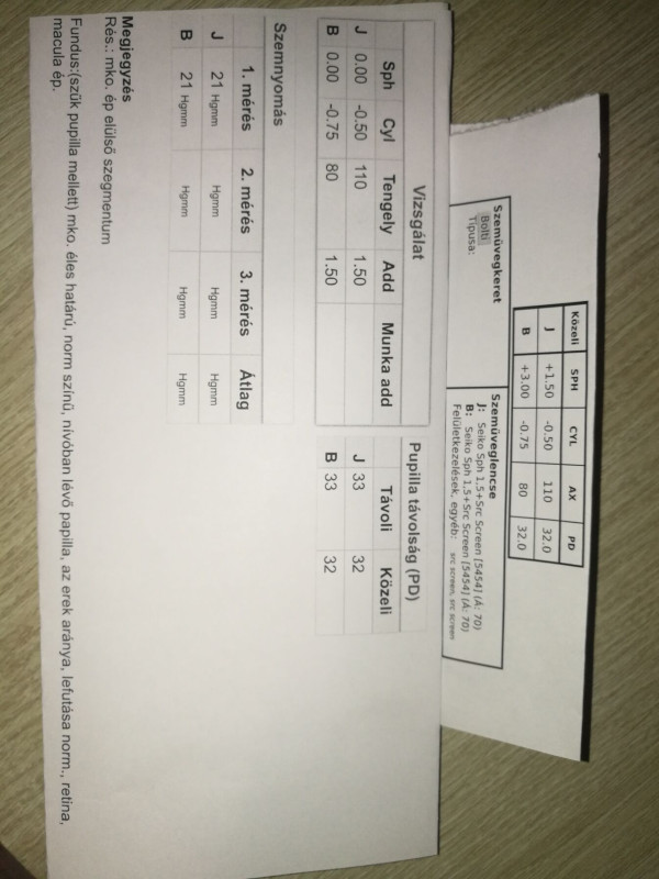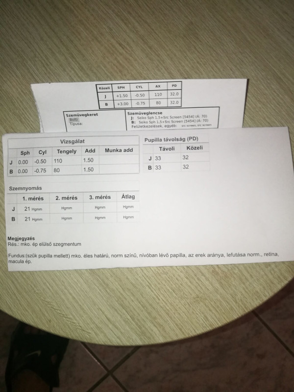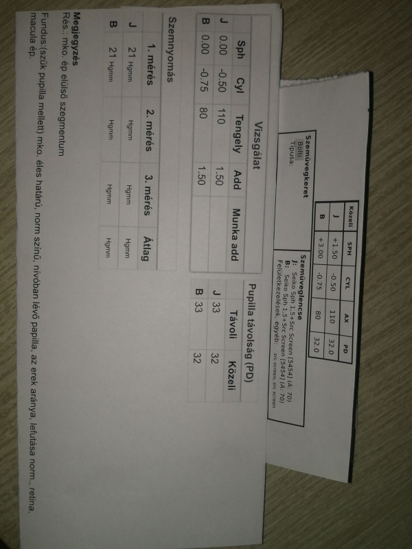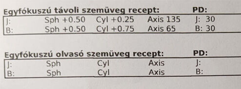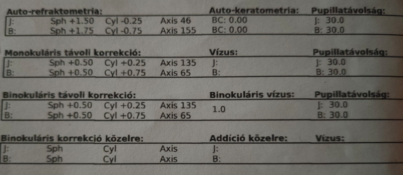 Nehezen megy az olvasás, ezért elmentem az ofoba látásvizsgálatra olvasószemüveghez. Az eredmény a következő lett: