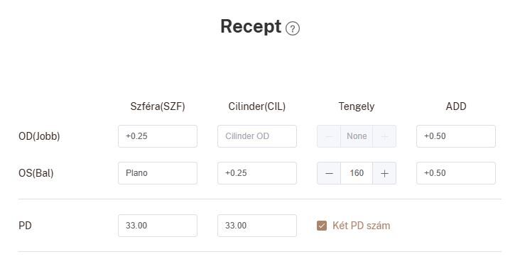 Amin kicsit elvesztem, hogy a Lensmart felületén ha Olvasó lencsét választok ki, akkor kötelezően meg kell adni az ADD értéket, ami az én receptemen nem szerepel. Utána olvasva a dolognak, ez a távol és közellátó diptria különbsége, így akkor helyes az alábbi kitöltés?