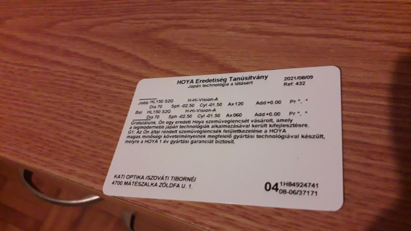 Nos rég jártam itt. A régi szemüvegem amit 21-ben csináltattam lett leváltva, igaz hólyagosodás miatt 22,23 és 24-ben is cserélték a lencsét. A vizsgálat kimutatta hogy nem romlott a szemem, így ugyan olyan erősségű lett a lencse csak elvileg jobb minőségű amire nem 1 hanem 3 év garanciát adtak. A régi Hoya H-HI-Vision-A lencse volt az új meg Hoya Uv-Control lett. Keret pedig egy ilyen. Remélem bírja majd mind a keret mind a lencse majd jó ideig probléma nélkül.