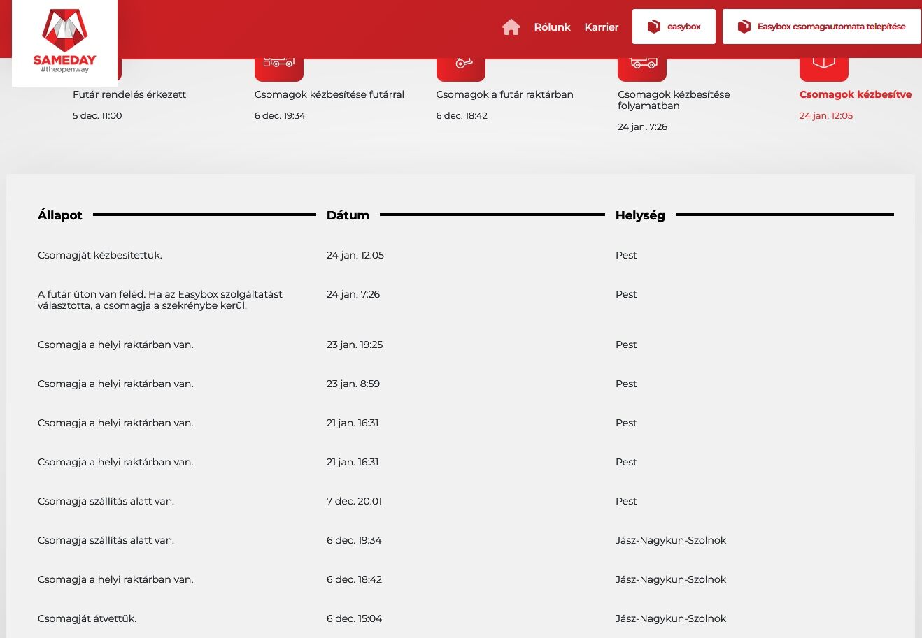 Igen jól látod jan 24én adta át a futár nekik a visszaküldött csomagom. Amit December (!) 6án vett fel tőlem a futár. A lista alja. Szerintem ezek a gyökerek nem vették át a csomagot, és a 6-8 adik panaszkönyv meg fenyegetőzés után keresték meg, hogy hol van. Addig vigyázott rá a sameday csapat. Letörölte róla a port, esti mesét olvasott neki stb.