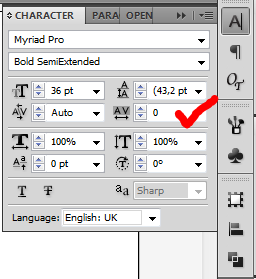 A gyorsbillentyűje is ugyanaz: Alt+jobbra/balra nyíl. Egyébként meg sok dologban próbálták összehozni a két progit, de azért látszik, hogy tényleg más világ a kettő, soha nem lesz ugyanolyan a kezelése. Viszont ebben speciel ugyanúgy működik, mint a Ps esetében. Csak a NAGYBETŰS, Kiskapitális meg ezek vannak eldugva a paletta mélyebb bugyraiba, a jobb felső nyíl alatti menübe.