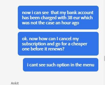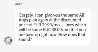 Egy éve vettem All Apps előfizetést egy évre, 38 eur/hóért. A jövő hónapban jár le, az accountomon, miután ma levonta az utolsó 38 eurt, a havi összeg 63.5-re változott, és február végén automatikusan megújul a normál árral. Felkerestem az ügyfélszolgálatot chaten, mert azt hittem, hogy a magasabb összeget akarták már most levonni. Kiderült hogy nem, de ha már ott voltam, rákérdeztem, hogyan tovább, maradhat-e a 38 euró havonta. Mire azt mondták, nem maradhat, vissza fog állni a 63 euróra. Na ekkor bevetettem a világ legprimitívebb cselét, mert sejtettem, hogy nem úgy van az, hát nem is. A varázsszó a cancel volt:mire ő:
