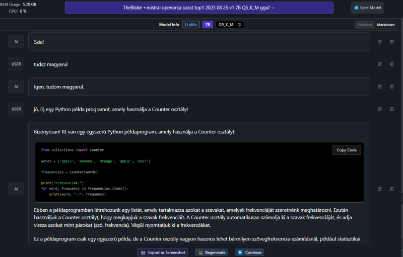 Azért ezt elég erős jó magyarnak nevezni de valamit válaszol (LLaMa 2 13B chat q5_0):