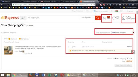 És most beléptem egy hónap után, és azt látom, hogy 32 dolog van Chart kosarban és rendelési hely be van állítva Russian Federation ra.
