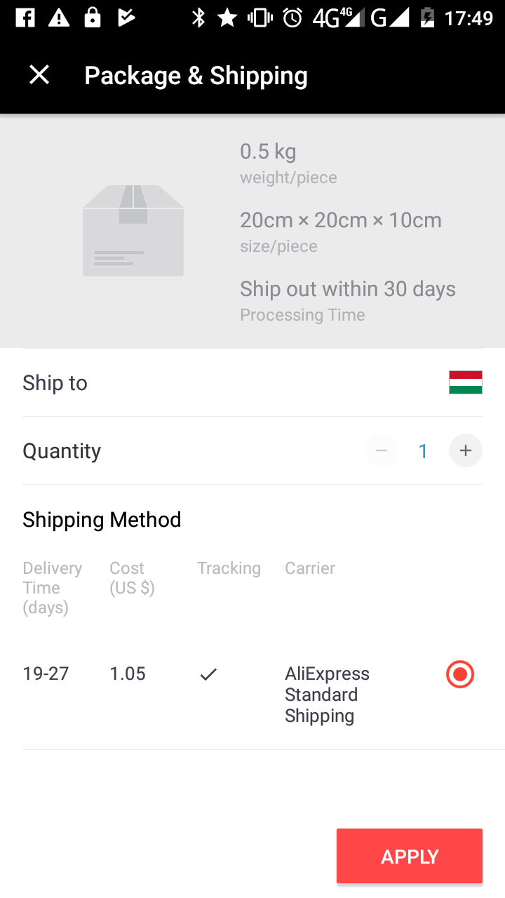 08.17.én rendeltem egy Livolo kapcsolót. A tracking utolsó bejegyzése 08.23-án történt shipped by air bejegyzéssel, azóta semmi. Írtam az eladónak 09.17.-én, akkor 2 hét türelmet kért tőlem, ami már inkább három hét. Ma írtam megint neki, a védelemből 6 nap pár óra van hátra. -