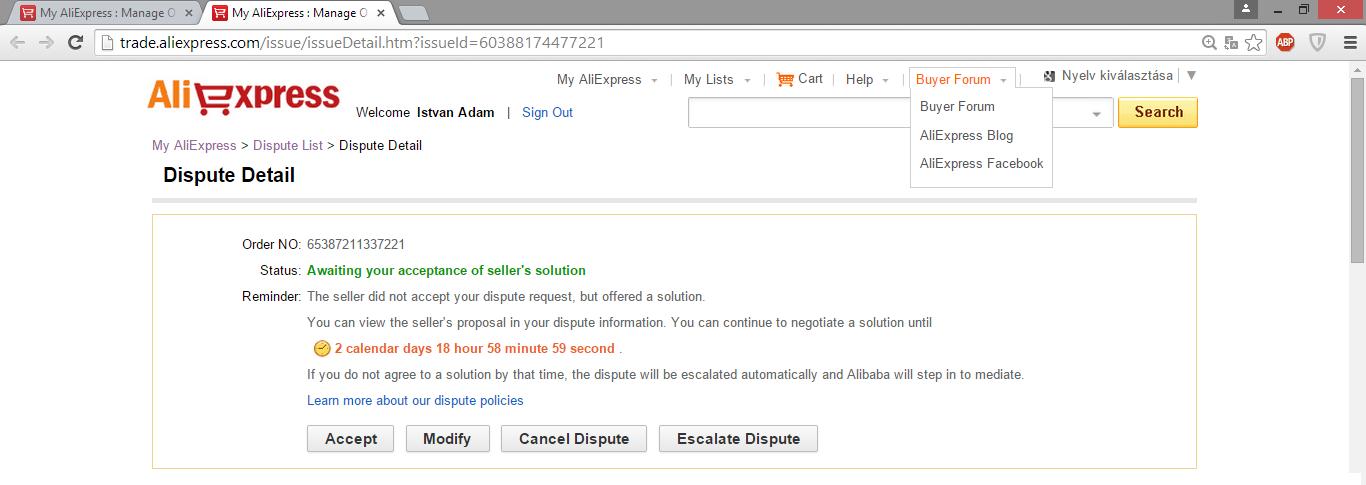 (#4095) madarasz92: Eszkalálhatod az ügyet az Aliexpress felé. (Escalate dispute) Ők megvizsgálják az esetet és döntenek, hogy kinek van igaza. Valószínűleg az lesz a döntés, hogy részleges visszatérítést kapsz és megtarthatod a terméket, vagy ha visszaküldöd a terméket, akkor teljes visszatérítést kapsz, de ebben az esetben a visszaküldés költségét neked kell fizetni. Illetve előfordul olyan is, hogy az eszkaláció hatására az eladó úgy dönt, hogy inkább visszaadja a pénzed.
